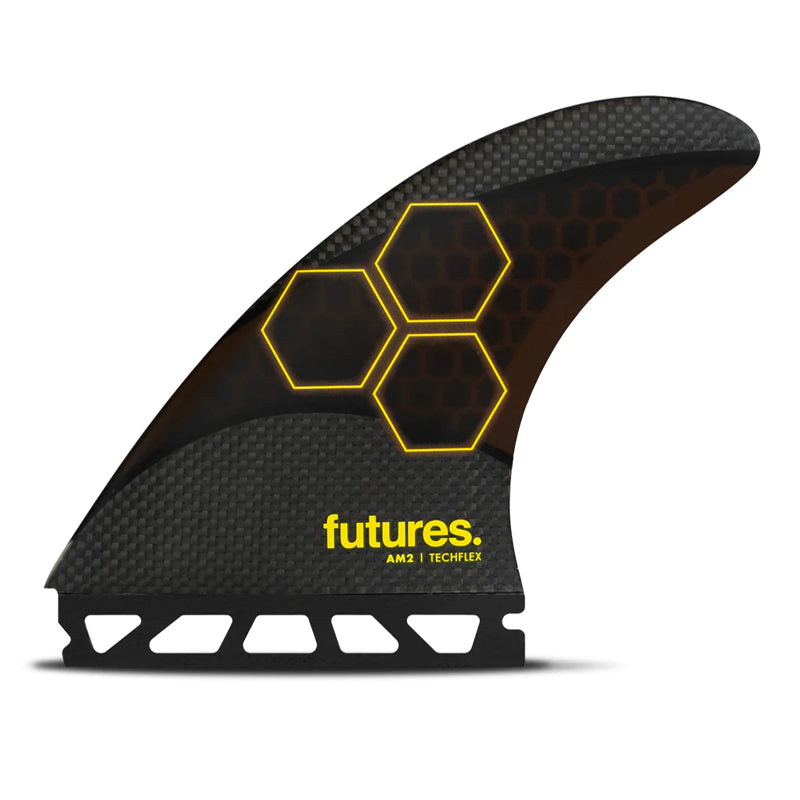 The AM2 Techflex, designed by legendary shaper Al Merrick of Channel Island Surfboards, is a large sized thruster in the Rake template category. This template features a wide base and refined tip, for the perfect combination of release and drive. The Techflex construction with the flat foil give this fin a stable feel giving it the speed control desired in powerful waves. This setup has a smaller center fin than the side fins for increased maneuverability.